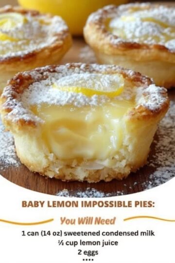 🍋 Baby Lemon Impossible Pies Sweet • Tangy • Effortless Yield: 8–10 mini pies (muffin tin)Time: ~10 min prep | ~35 min bake Ingredients ½ cup all-purpose flour ¾ cup granulated sugar 2 cups milk (room temp) 4 large eggs ½ cup melted butter, slightly cooled ¼ cup fresh lemon juice Zest of 1–2 lemons […]