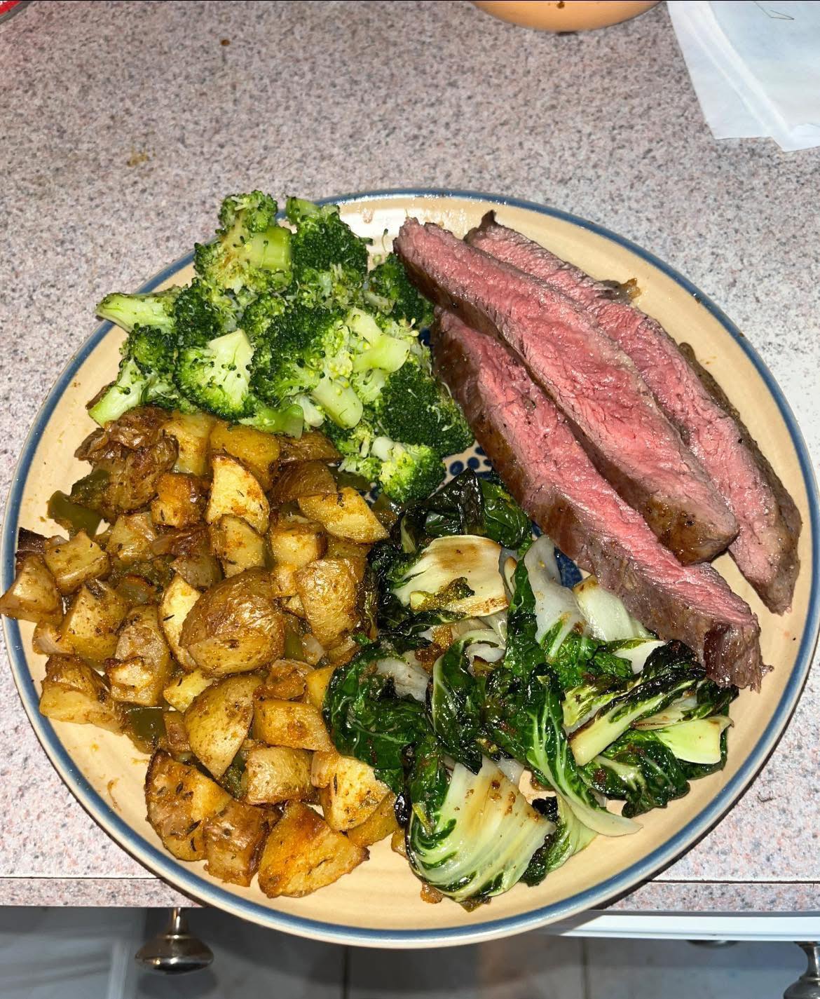 Seared steak with roasted potatoes, sautéed bok choy and steamed broccoli