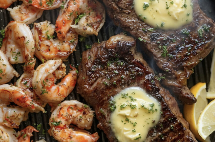 Surf and turf (steak and shrimp with garlic butter).