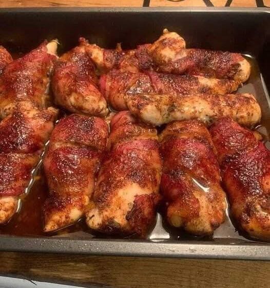 Bake for 25–30 minutes, turning once halfway through, until chicken is cooked through and bacon is crispy.