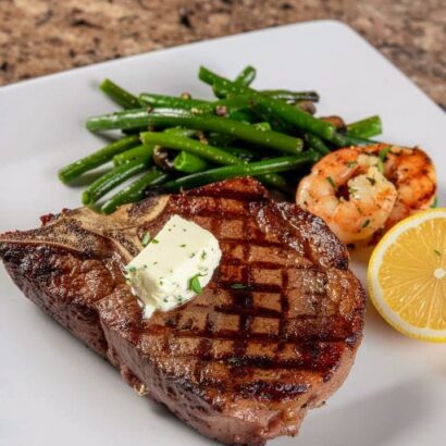 This restaurant-style surf and turf dish is made in one skillet and consists of juicy, buttery ribeye steaks paired with sizzling garlic shrimp and charred lemon.