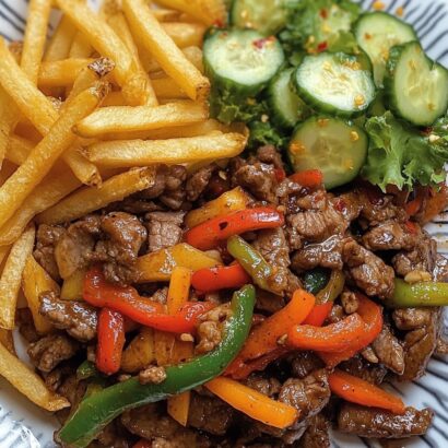 In the same pan, add sliced onion and pepper. Sauté until softened and lightly caramelized. Add garlic and season.