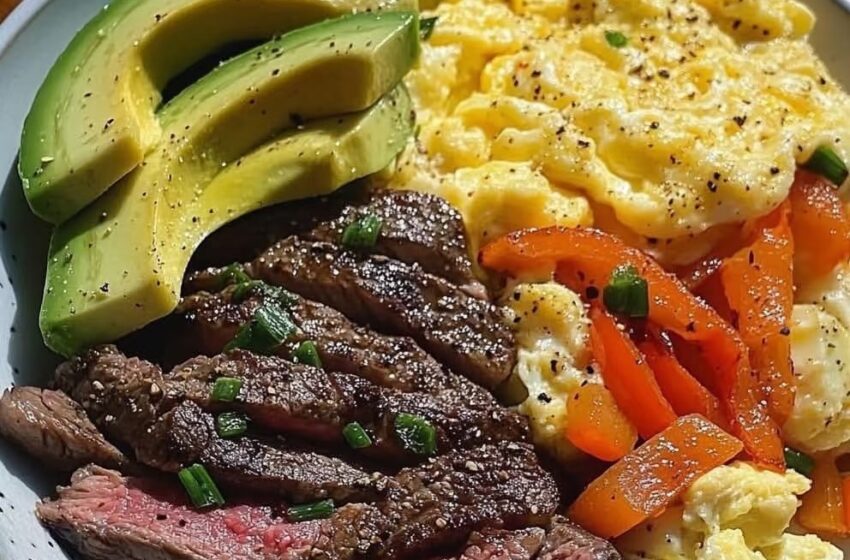 Steak & Scrambled Eggs with Sautéed Peppers + Fresh Avocado