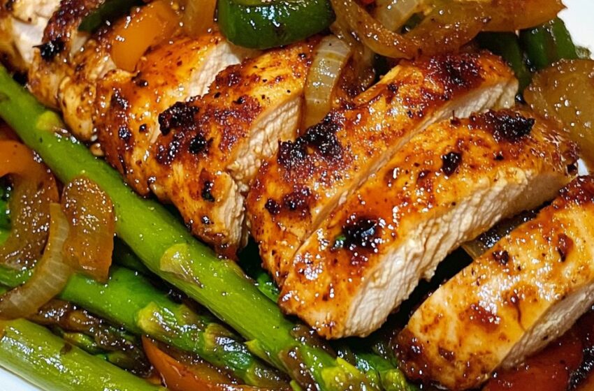 Juicy, well-seasoned chicken breast, tender asparagus, and sweet sautéed peppers and onions. It’s bold, colourful and bursting with flavour — perfect for a protein-packed lunch or dinner!