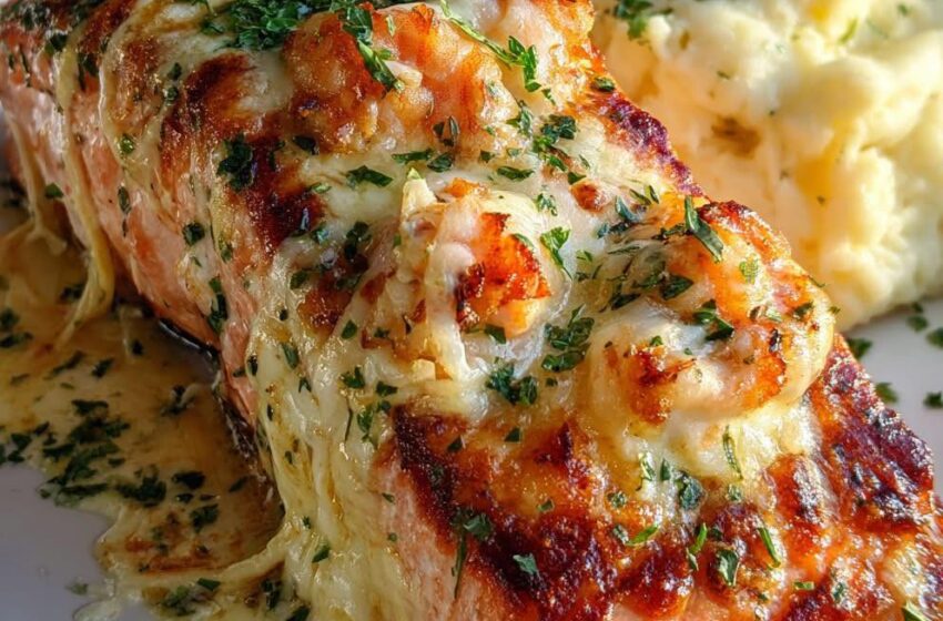 Gently stuff the cheesy shrimp mixture into the salmon pockets. Heat olive oil in a skillet over medium-high and sear salmon, 3–4 mins per side, for that crispy golden finish.