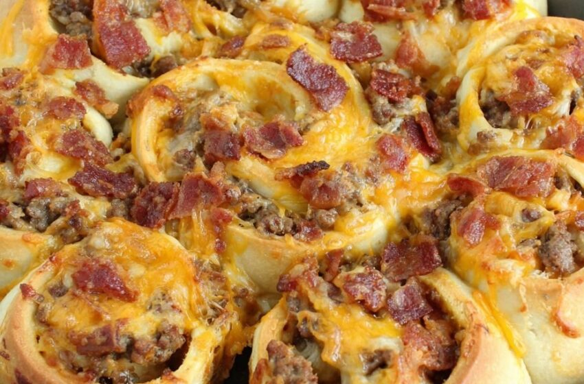 These pinwheels feature crispy crescent dough wrapped around layers of cheddar and mozzarella cheeses, savoury beef, smoky bacon and a hint of pizza sauce. This playful take on classic comfort food brings together all the familiar flavours of cheeseburgers and pizza, baked to create an irresistible flavour in every bite. Perfect as a hearty appetiser or casual meal, these golden pinwheels are easy to make and ideal for sharing at gatherings or family dinners. Enjoy the delicious blend of melted cheese, tender beef and crunchy bacon in this irresistible dish.
