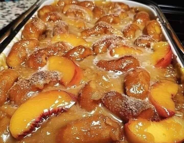 · Carefully spoon the warm peach mixture and its syrup over the top of the batter. Do not stir! It will look messy and uneven—that’s perfect.