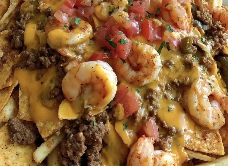 This satisfying dish showcases bold Southern flavours, with crispy seasoned fries and golden tortilla chips piled high with spicy minced beef and buttery sautéed shrimp. A homemade cheddar and Monterey Jack cheese sauce brings silky richness to the whole dish, while diced tomato and parsley provide a fresh contrast. Every mouthful offers a blend of smoky paprika, garlic and tender seafood, making this a crowd-pleasing appetiser or indulgent comfort meal that’s perfect for sharing with friends or family. For maximum crunch and flavour in every layer, enjoy right away.