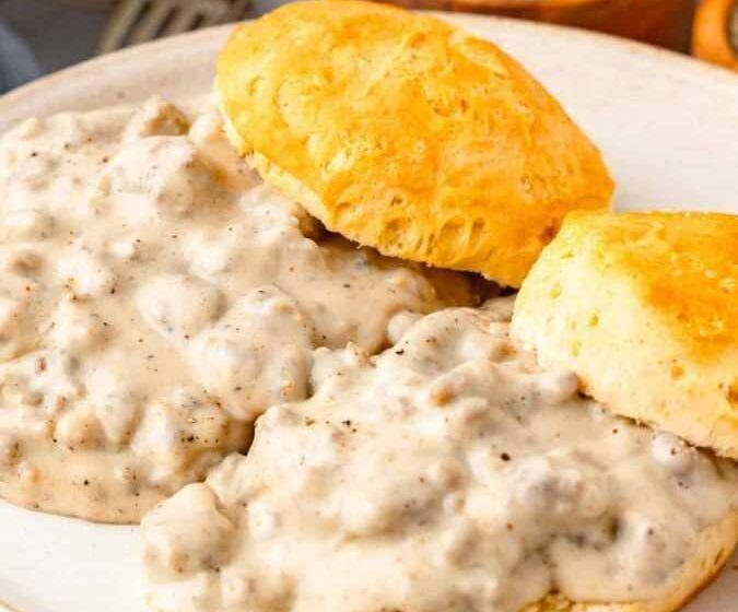 For this classic Southern breakfast, you will need all-purpose flour, baking powder, salt, butter or shortening, milk, breakfast sausage, and optional black pepper and herbs for extra flavor. Fluffy homemade biscuits paired with creamy, savory sausage gravy make for a hearty, comforting start to the day.