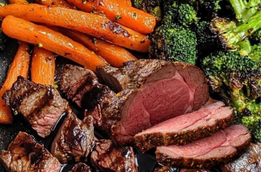 A high-protein, flavour-packed meal featuring juicy, seared prime rib bites; caramelised, roasted carrots; and crispy, charred broccoli with a touch of balsamic vinegar. Easy, fast and incredibly satisfying!