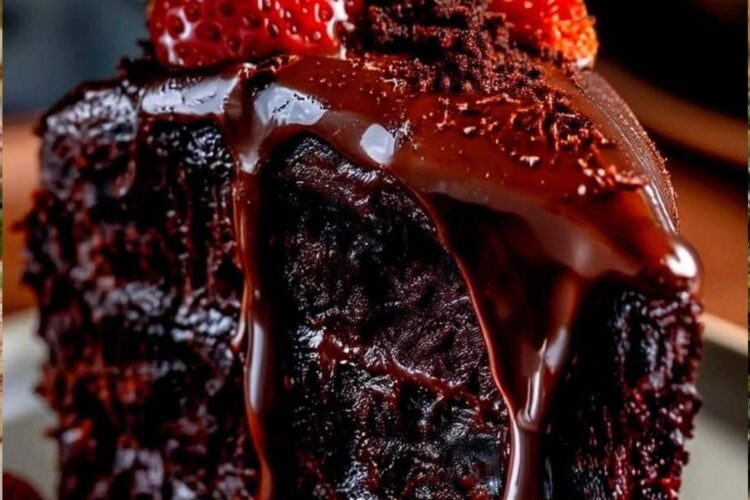 A tall, glossy chocolate cake with a brownie-soft center, shiny ganache on top and that deep café aroma from hot coffee baked into the batter. Every slice is ultra moist, ultra fudgy and honestly a little dangerous to keep in the fridge… it just disappears.