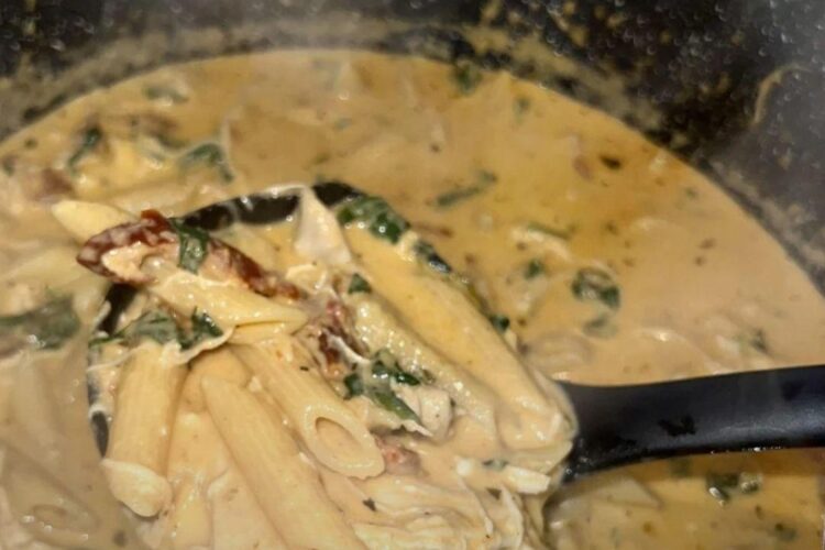 You’ll need 2 tablespoons olive oil or butter, 1 diced onion, 3 minced garlic cloves, 1 teaspoon Italian seasoning, ½ teaspoon chili flakes, salt and black pepper, 4 cups chicken broth, 1½ cups heavy cream, 1 cup grated parmesan, 2 cups cooked shredded chicken, 1 cup chopped sun-dried tomatoes, 2 cups dry penne pasta, and 2 big handfuls of fresh spinach. You can finish with extra parmesan and a squeeze of lemon if you like it a bit brighter.
