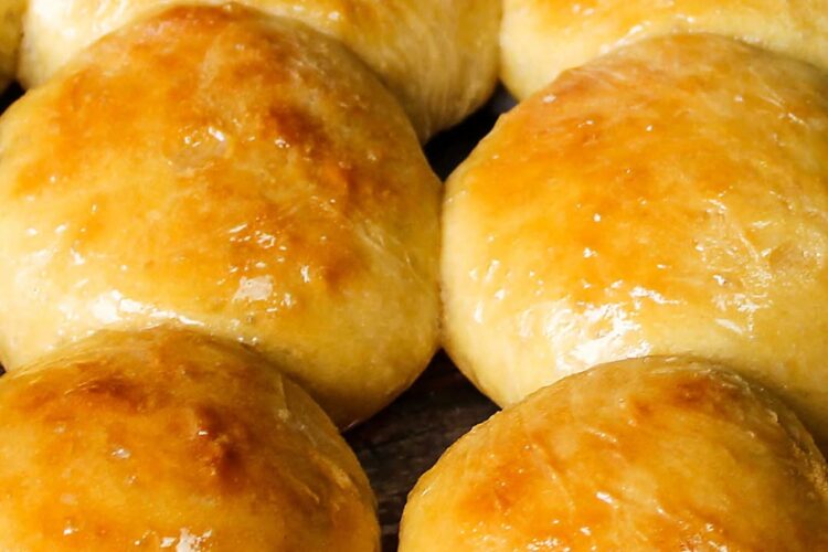 Brush hot rolls with melted butter.