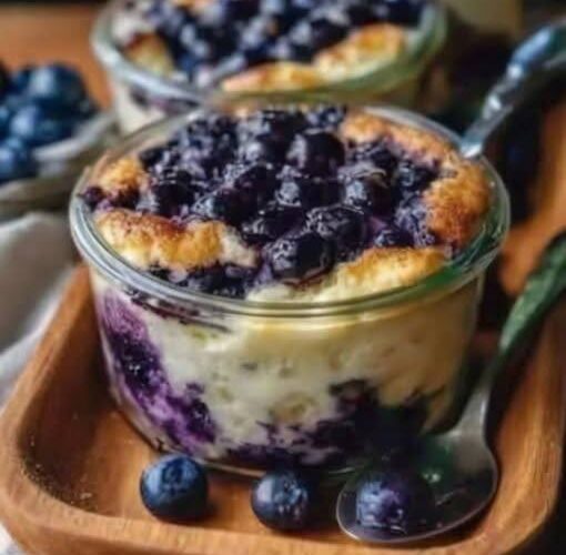 Divide your blueberries evenly among the four jars, about ⅓ cup per jar. They’ll settle to the bottom and create this gorgeous fruity layer that gets jammy and sweet as everything bakes. If you’re using frozen berries, don’t bother thawing them—they work perfectly straight from the freezer.