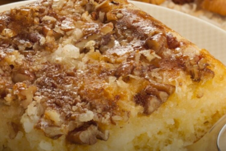 - Pour batter over pecan mixture in prepared pan and bake until a toothpick inserted into the center comes out clean, about 35-40 minutes.