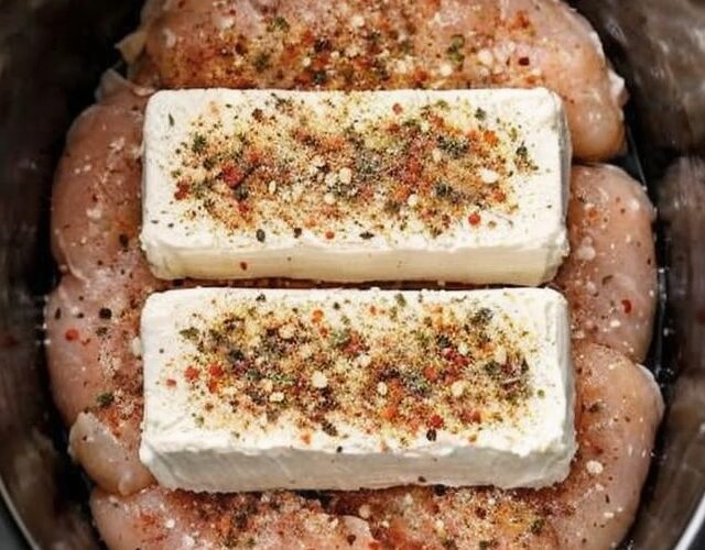 2. Scatter those yummy cream cheese chunks all over the top of the chicken.