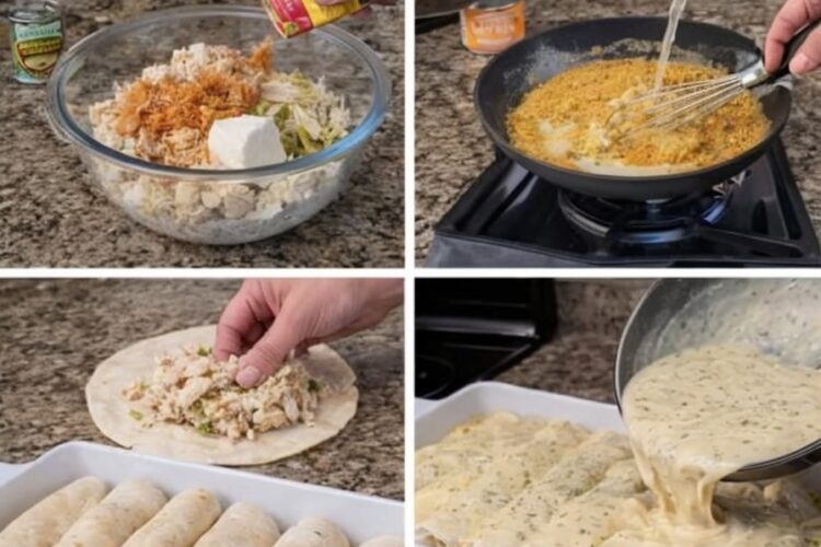 Ingredients – 1 rotisserie chicken, shredded (about 3 cups) – 1 packet (1 oz) taco seasoning, divided – 6 to 8 medium flour tortillas – 4 oz cream cheese, softened – 2 cups shredded Monterey Jack cheese, divided – 1 cup sour cream – 1 cup chicken broth – 1 can (4 oz) diced green chiles, drained – 1/2 cup heavy cream (or milk for a lighter version) – 2 cloves garlic, minced – Salt and pepper to taste – Optional: chopped cilantro for garnish Instructions Warm the shredded chicken in a skillet with half the taco seasoning over medium heat until fragrant, about 5 minutes – stir in the cream cheese until it melts into a creamy mix. Spoon the chicken filling evenly into the tortillas, roll them up snug, and place seam-side down in a greased 9×13 baking dish. In the same skillet, whisk together the sour cream, chicken broth, green chiles, garlic, remaining taco seasoning, and heavy cream. Simmer until it thickens slightly and smells heavenly nutty, about 5-7 minutes – season with a pinch of salt. Pour the sauce over the enchiladas, top with the remaining Monterey Jack, and bake at 350°F for 20-25 minutes until bubbly and the cheese is golden and stretched. Let it rest 5 minutes so the sauce sets just right. The trick is letting that sauce bubble a bit before baking – it caramelizes the top without drying out. Who in your life needs this cozy dinner tonight? ❤️