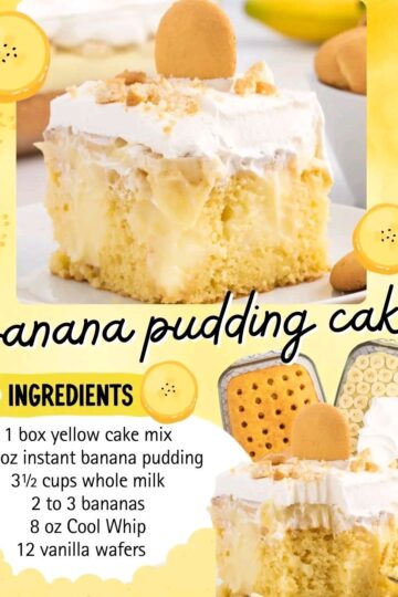 Ingredients: For the Cake 1 box yellow cake mix 5.1 ounces instant banana-flavored pudding mix 3½ cups whole milk For the Topping 2 to 3 ripe bananas, sliced 8 ounces Cool Whip whipped topping 12 vanilla wafers, crushed or whole for garnish Instructions: Preheat oven to 350°F (175°C). Grease a 9×13-inch baking dish. In a […]