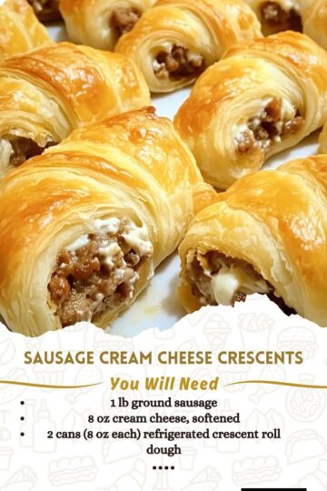 Ingredients: 1 lb ground sausage 8 oz cream cheese, softened 2 cans (8 oz each) refrigerated crescent roll dough Instructions: Preheat oven to 375°F (190°C). Line a baking sheet with parchment paper or lightly grease it. In a skillet over medium heat, cook the ground sausage until fully browned. Drain excess grease. Reduce heat to […]