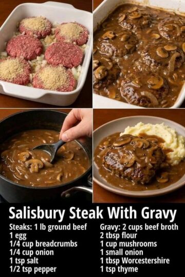 Ingredients: FOR THE STEAKS 500 g ground beef 1/2 cup breadcrumbs 1 large egg 1 teaspoon Worcestershire sauce 1 teaspoon garlic powder 1/2 teaspoon onion powder 1/2 teaspoon salt 1/2 teaspoon black pepper FOR THE ONION GRAVY 2 tablespoons butter or oil 1 large onion, thinly sliced 2 tablespoons all-purpose flour 2 cups beef broth […]