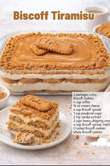Ingredients: COOKIE LAYER 2 packages Lotus Biscoff cookies ½ cup warm milk or coffee (optional) BISCOFF CREAM FILLING 16 oz (2 blocks) cream cheese, softened ¾ cup Biscoff spread (smooth) 1 cup powdered sugar 2 teaspoons vanilla extract 2 cups cold heavy whipping cream (or Cool Whip) TOP LAYER ½ cup Biscoff spread, melted TOPPING […]