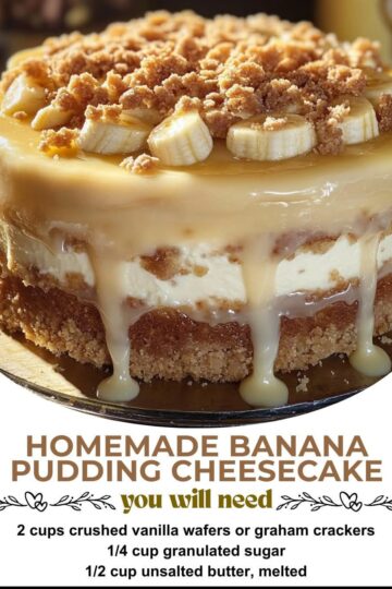 🍰 Banana Pudding Cheesecake 🧾 Ingredients Crust 2 cups vanilla wafer crumbs (about 50 wafers) ¼ cup sugar ½ cup melted butter Cheesecake Filling 24 oz (3 blocks) cream cheese, room temp 1 cup sugar 3 large eggs, room temp 1 cup mashed ripe bananas (2–3 bananas) ½ cup heavy cream or sour cream 1 […]